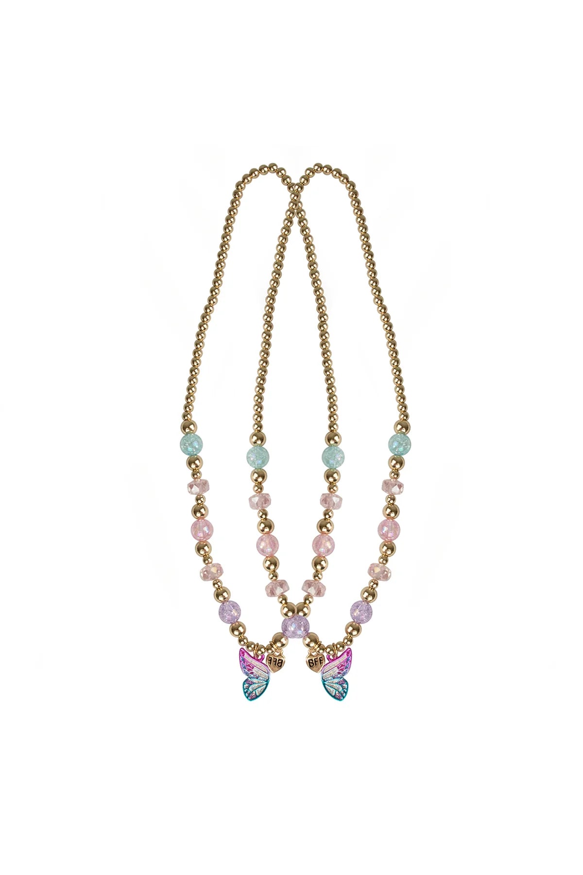 Share the love with your bestie with our Butterfly Wishes BFF necklaces! This set includes two gold toned beaded necklaces, with half a butterfly pendant with a gold BFF heart on each. Our children's jewelry is strung with double the elastic to add extra durability.