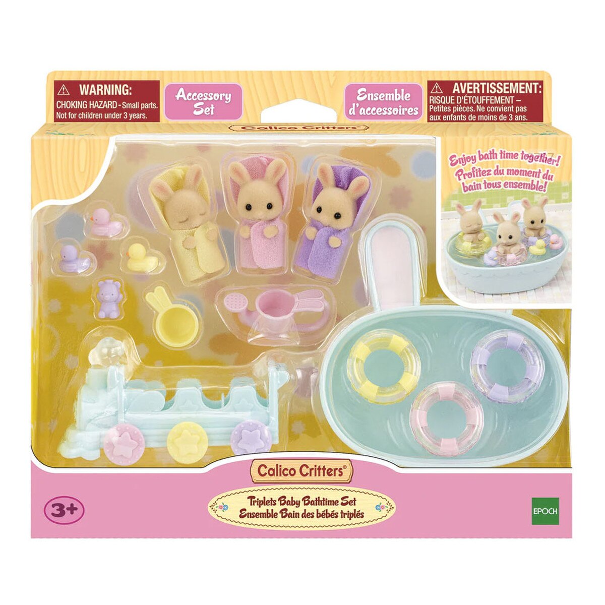 The Calico Critters Baby Bathtime set has everything you need to take care of the Milk Rabbit triplets! Rabbit-shaped tub with floaties and ride-on train plus additional accessories including rubber duckies, bath wraps and more!