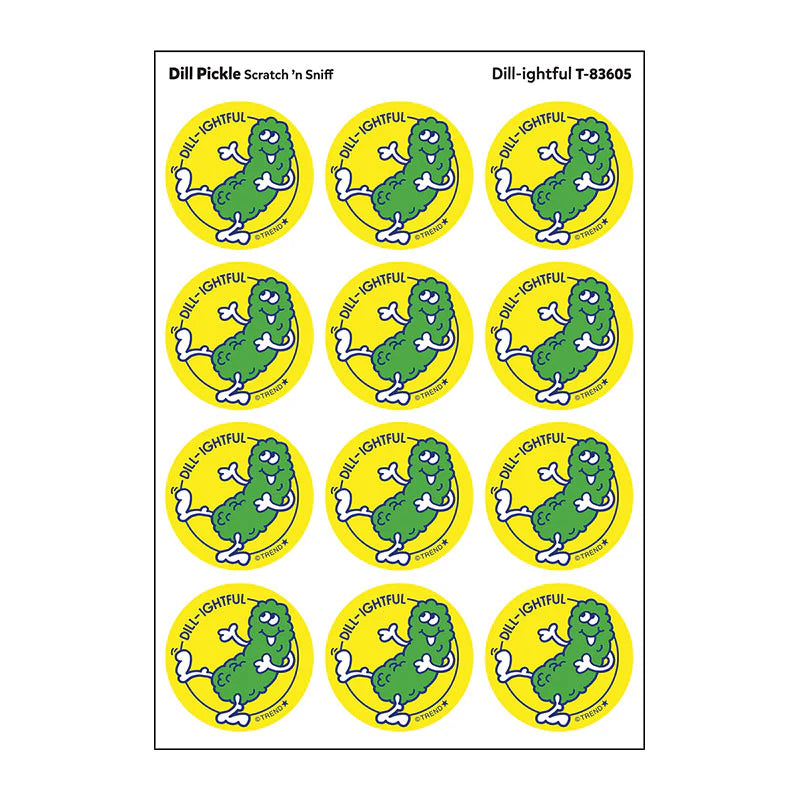 Get a whiff of this Dill-ightful, dill pickle-scented sticker! TREND Scratch 'n Sniff Stinky Stickers® from the '80s are BACK! And they're SCENT-sational! Fun to collect, trade, and celebrate accomplishments and special occasions. Collectors will be happy to spot the ★ to distinguish TREND Retro Stinky Stickers® from those printed in the 1980s.