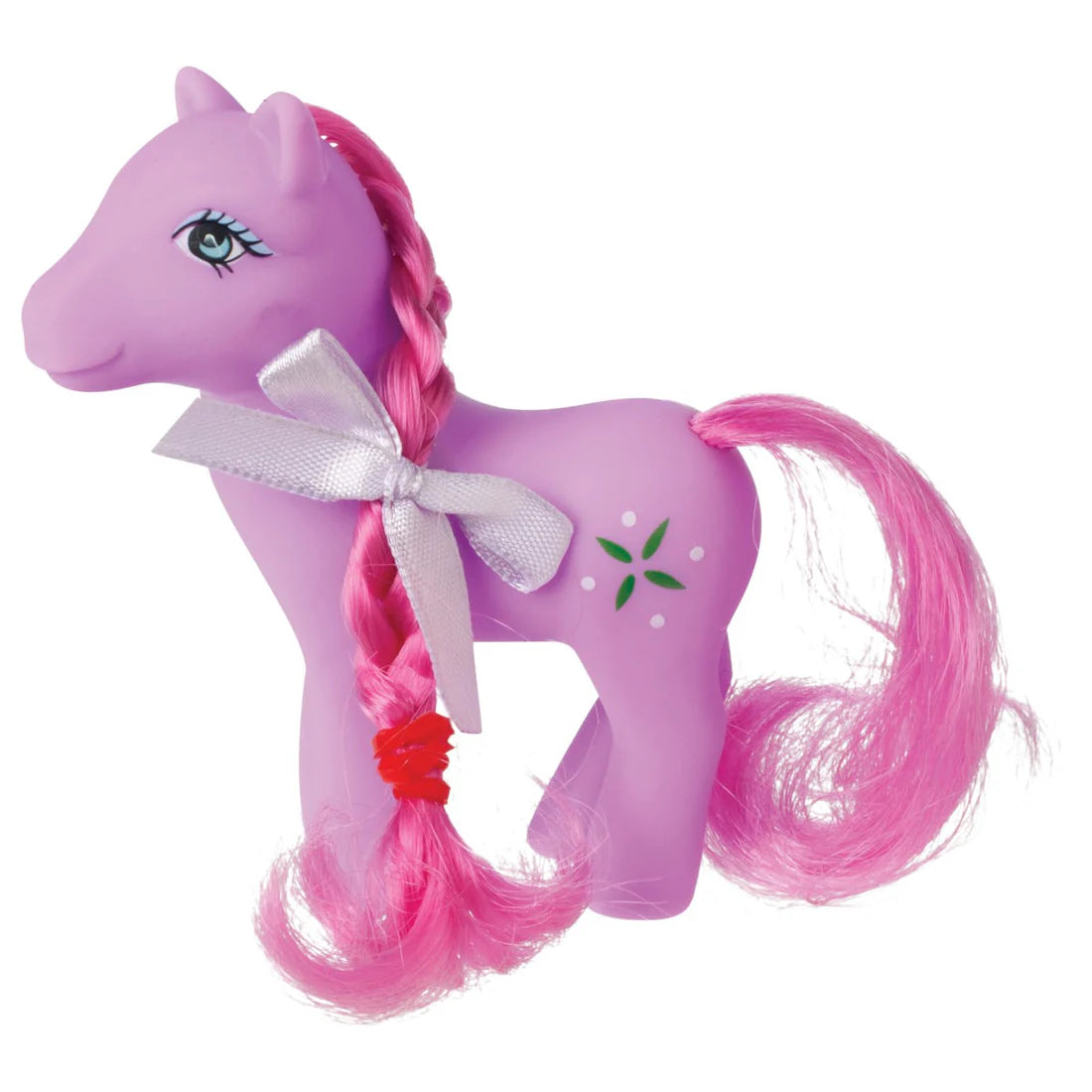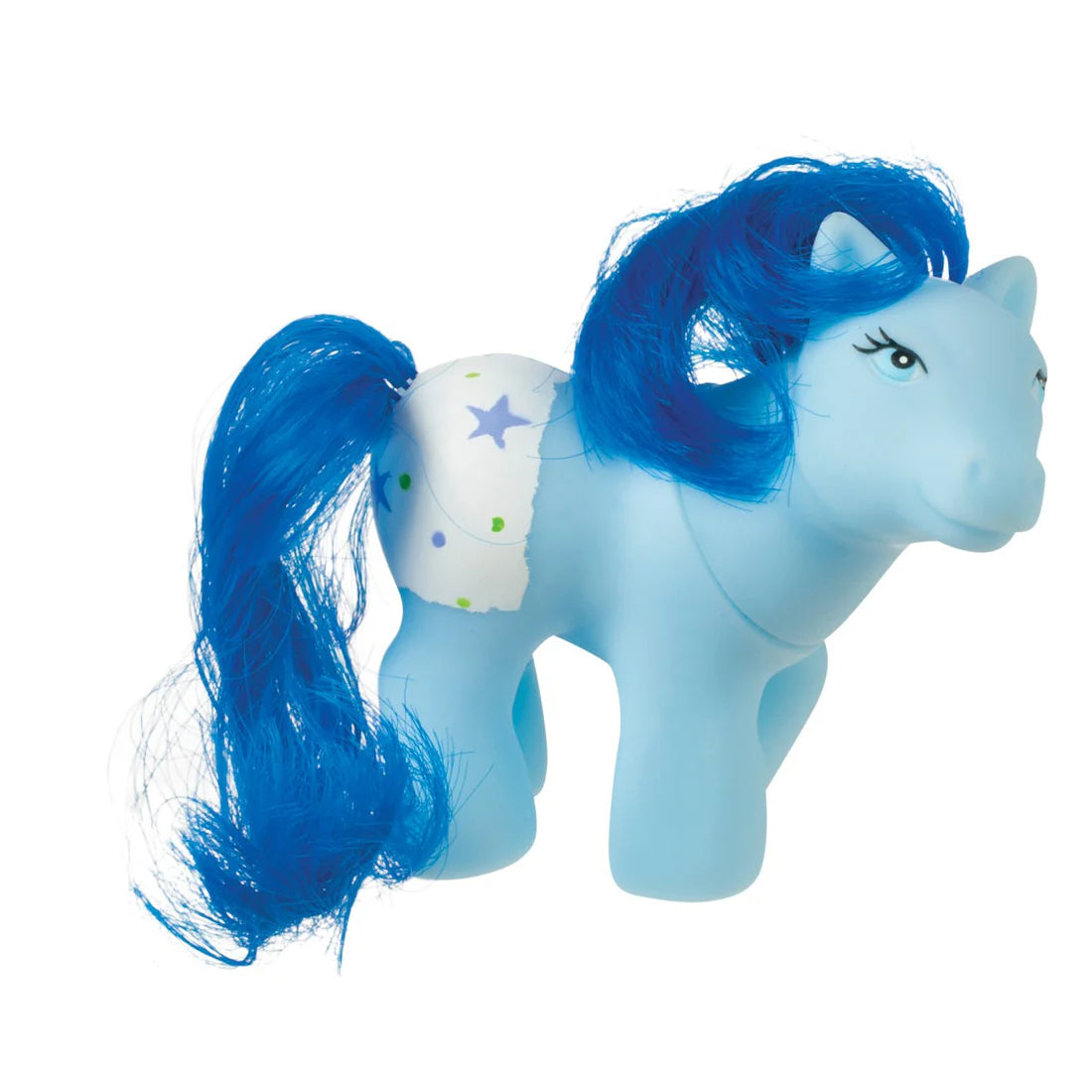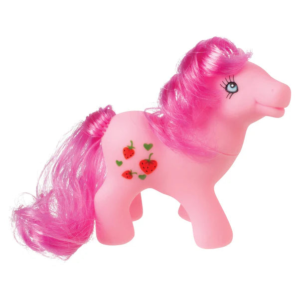 Popular hair-play and pretend-play items, Precious Ponies come in 3 unique styles. Body colors are pink, blue, or purple: each has different facial features and rear-end designs. Decals on the rump include strawberries, flowers, or stars and may be a mix of white, green, blue, and red. Facial features include blue eyes, black eyelashes and colored eyeshadow. Each pony figure measures 2.5 inches and comes with a light-pink plastic brush or comb.