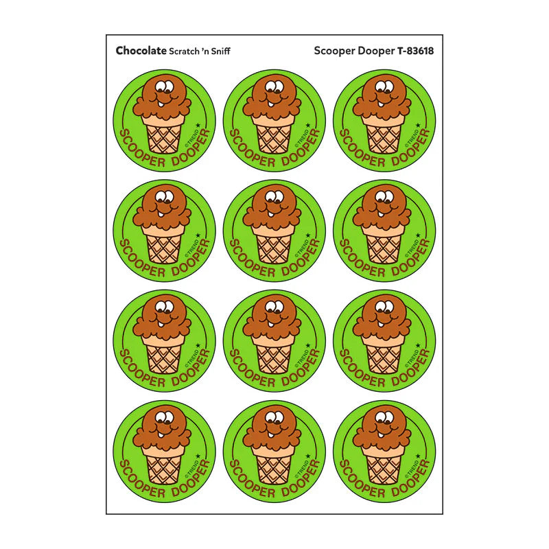 Get a whiff of this Scooper Dooper, chocolate-scented ice-cream cone sticker! TREND Scratch 'n Sniff Stinky Stickers® from the '80s are BACK! And they're SCENT-sational! Fun to collect, trade, and celebrate accomplishments and special occasions. Collectors will be happy to spot the ★ to distinguish TREND Retro Stinky Stickers® from those printed in the 1980s.