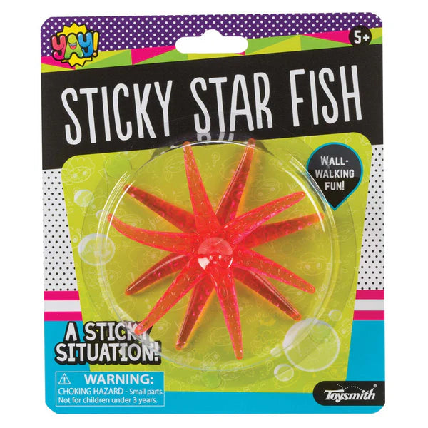 Each Sticky Star Fish from YAY! measures 4 inches and is made to stretch apart and stick onto hard surfaces. Comes in red, pink, green, and blue neon hues with an opaque ball-like center and 12 translucent arms that wiggle and stretch. Made with high-quality, nontoxic rubber that’s soft to touch but durable enough to pull. Will not stick to carpet, clothing, or hair. A peggable blister packet contains 1 Sticky Star Fish.