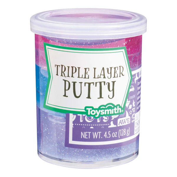 Triple Layer Putty from Toysmith comes in a plastic 2.5-inch jar with a plastic lid to keep it contained when not in use and to make it easy to take on the go. Triple Layer Putty toy comes with 3 different colored slimes, each chock full of sparkling glitter for magical stretchy, gooey fun. Color combinations vary but may include pink, purple, blue, and green. A total of 4.5 ounces of slime is provided. Slime is nonstick and ideal for stretching, sculpting, and stress relief.